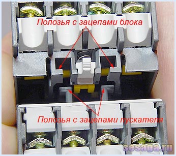 Фиксируется блок контактов на пускателе специальной защелкой. А чтобы блок снять, достаточно приподнять защелку и выдвигать блок в сторону защелки.