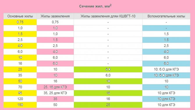 Общее сечение кабеля (кв. мм) является результатом суммирования отдельных сечений всех проводников, в него входящих. Так, для кабелей электрических силовых: