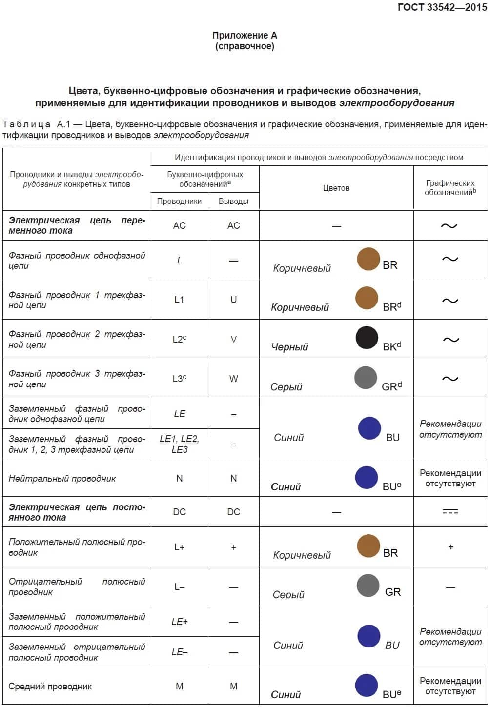 Как я уже писал выше, берем последний официально внедренный в Армении, Беларуси, Киргизии, Молдове, России и Таджикистане ГОСТ 33542–2015, далее находим там таблицу A.1, которая однозначно регламентирует цвета, буквенно-цифровые и графические обозначения, применяемые для идентификации проводников и выводов электрооборудования. И пользуемся!