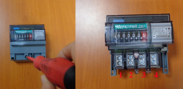 Подключение счетчика Меркурий 201 в электрощите осуществляется согласно схеме, рассмотренной выше или напечатанной в технической документации, прилагающейся к устройству. Монтаж электросчетчика в щите производится на DIN-рейку с использованием специальной крепежной планки, но мы рассмотрим этот процесс без привязки к распределительному щитку. В качестве образца возьмем прибор учета с механическим индикатором количества потребленной электроэнергии.