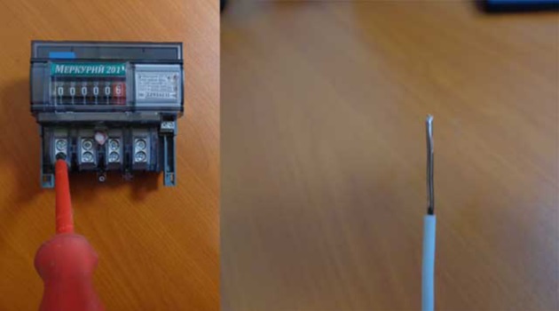 На втором этапе ослабляем все четыре зажима подключаемых проводников, зачищаем концы проводов от изоляции и приступаем непосредственно к подключению счетчика к сети подачи электроэнергии.