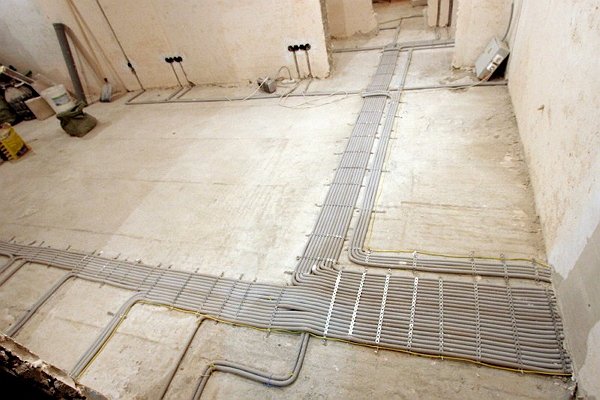 Можно пустить разводку и по полу, но в этом случае потребуется увеличить толщину стяжки. В многоквартирных домах такой вариант практически не применяется.