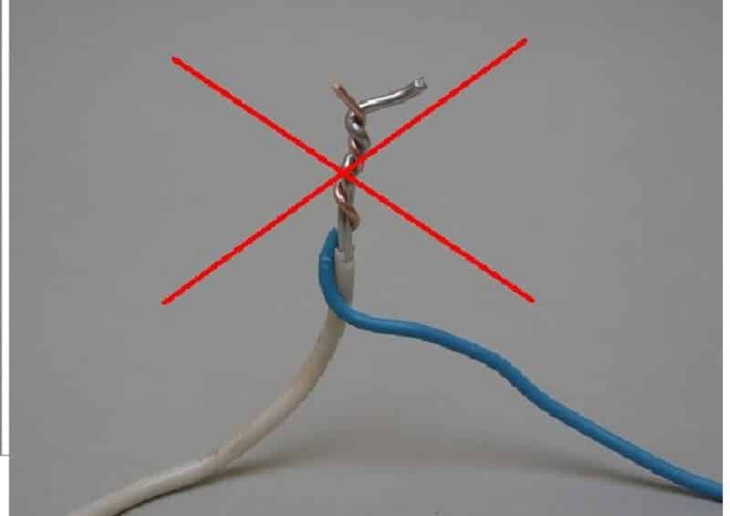 - Объединение нескольких проводов разных металлов. Нельзя совмещать разные провода, особенно медь и алюминий. Во время контакта двух кабелей произойдет нагрев. Поскольку нельзя даже допускать пересечение двух шнуров из одинакового металла, а если такое произойдет с разными веществами, то вообще есть риск аварии.