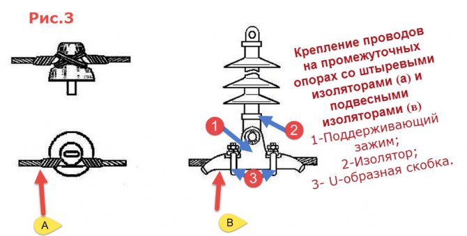На рис 3 показано крепление проводов без изоляции на промежуточных опорах. Здесь, два типа соединений вязка (рис 3, а) и поддерживающий зажим (рис 3,б).