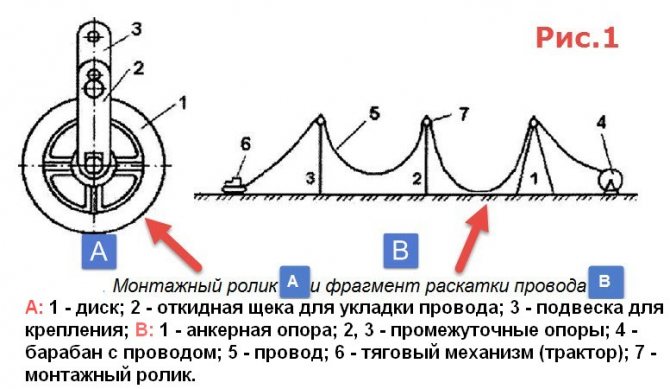 Для раскатки проводов на опорах вешаются монтажные ролики (фото 1). Провод перед раскаткой вывешивается провод ВЛ.
