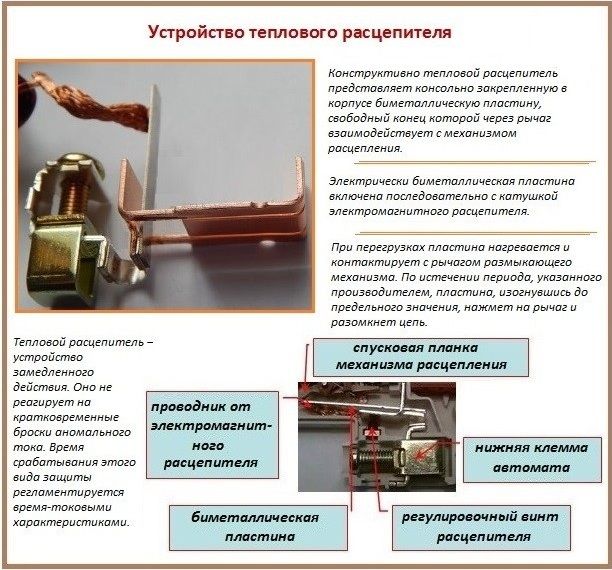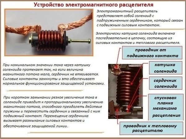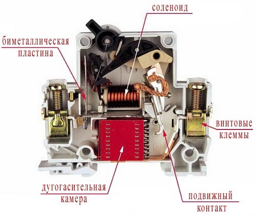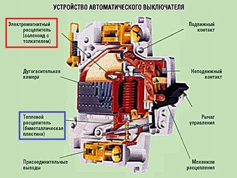 В конструкции автоматического выключателя существуют два элемента, которые реагируют на превышение нагрузки в электропроводке.