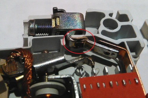 Подгоревший из-за принудительного включения автомата контакт биметаллической пластины