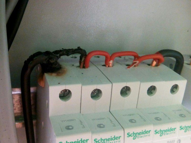 Слабое крепление проводов вызвало оплавление контакта автомата