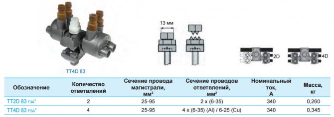 Гнезд для проводов бывает 2 или 4. Они могут быть различного диаметра, например, 16–120 и 6–50. Здесь первая группа цифр — сечение основного провода, вторая — дополнительно подключаемого. Одно из достоинств зажимов СИП — в том, что они (в известных пределах) подгоняются под кабели различных калибров.