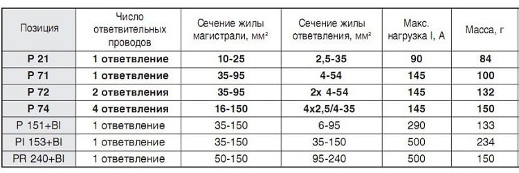 - Зажим Р 70. Несущая магистраль имеет 25 – 150 мм кв. сечение, а разветвление – 25 – 120 мм кв.