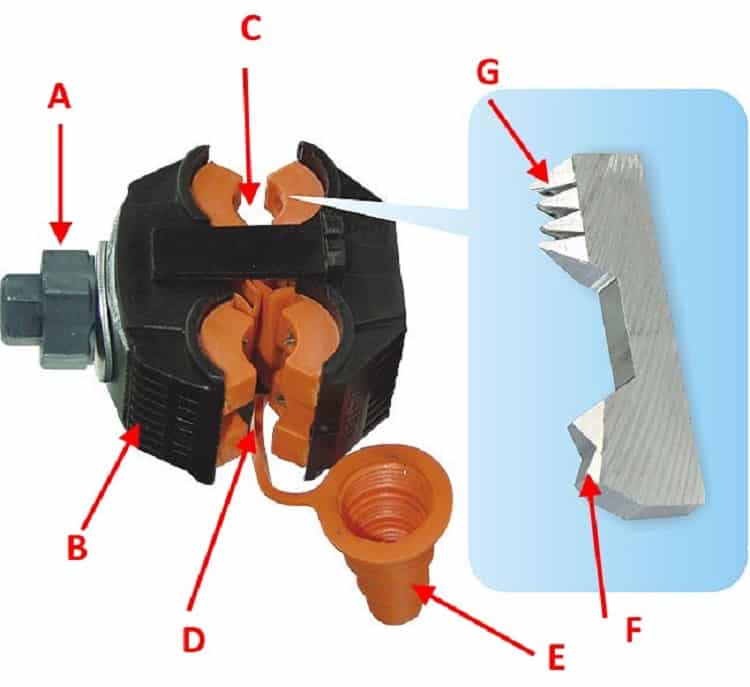 В процессе подключения затягивается болт, под его давлением ножи зубчатого контакта (G) прорезают изоляцию СИП и обеспечивают надежный контакт. В это же время контактная площадка (F) обеспечивает сцепление с магистральной жилой. Обратим внимание, что конструкция затягивающего механизма устроена таким образом, чтобы не допустить разрывного воздействия. То есть, болт «срывается» при достижении порогового усилия.