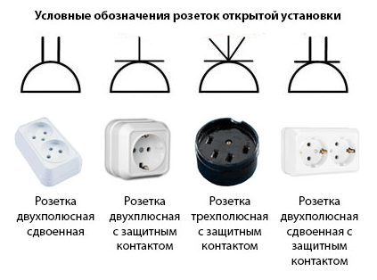 Условные графические обозначения розеток и выключателей в электрических схемах. Включают в разработанные чертежи электрификации домов, квартир, производств.