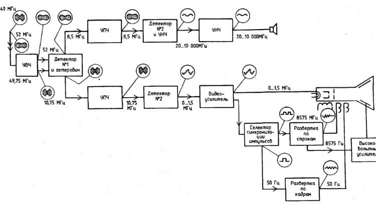 Функциональная, на ней представлены узловые элементы (изображаются как прямоугольники), а также соединяющие их линии связи. Характерная особенность такой схемы – минимальная детализация. Для описания основных функций узлов, отображающие их прямоугольники, подписываются стандартными буквенными обозначениями. Это могут быть различные части изделия, отличающиеся функциональным назначением, например, автоматический диммер с фотореле в качестве датчика или обычный телевизор. Пример такой схемы представлен ниже. Пример функциональной схемы телевизионного приемника