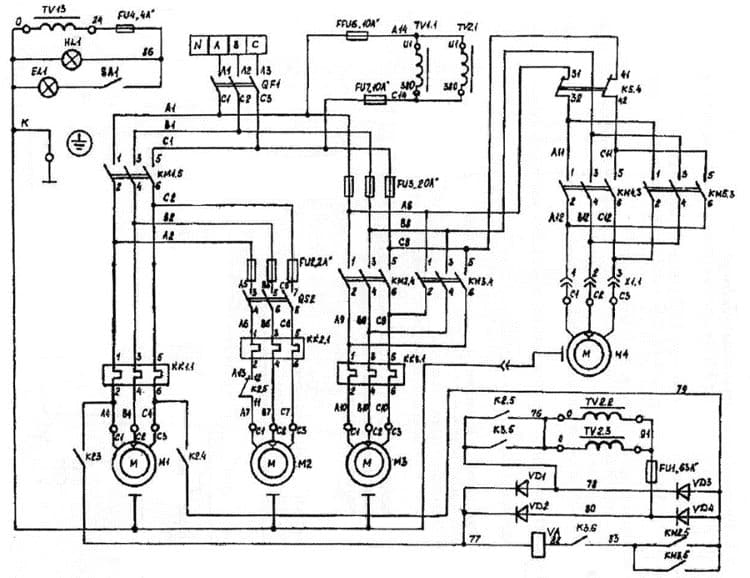 В связке с электромоторами, на схемах показаны магнитные пускатели, устройства мягкого пуска, частотный преобразователь. Эти устройства служат для запуска электрических моторов, бесперебойной работы системы. Последние два элемента уберегают сеть от «просадки» напряжения в сети.
