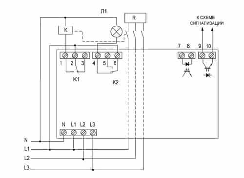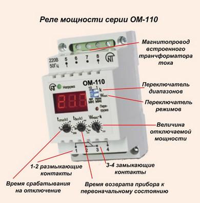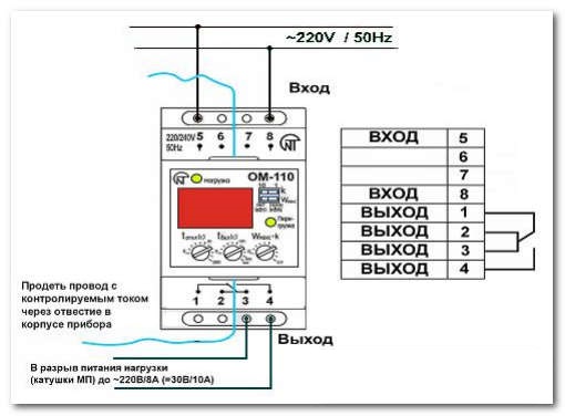 Схема подключения однофазного реле ограничения мощности ОМ-110