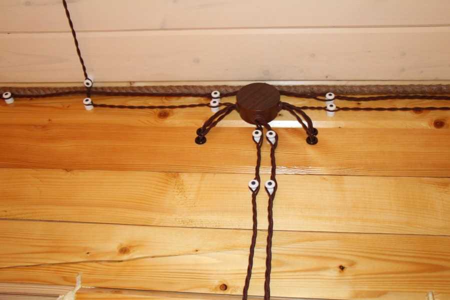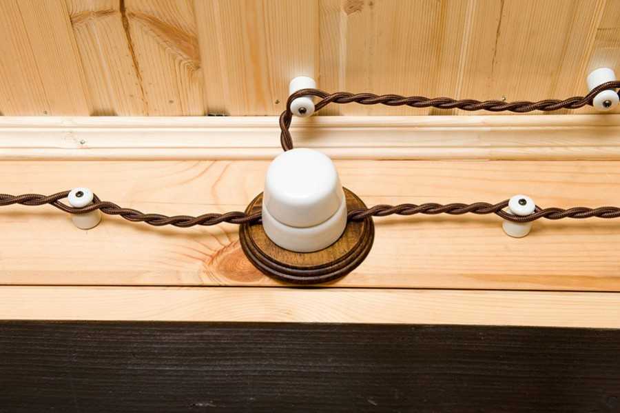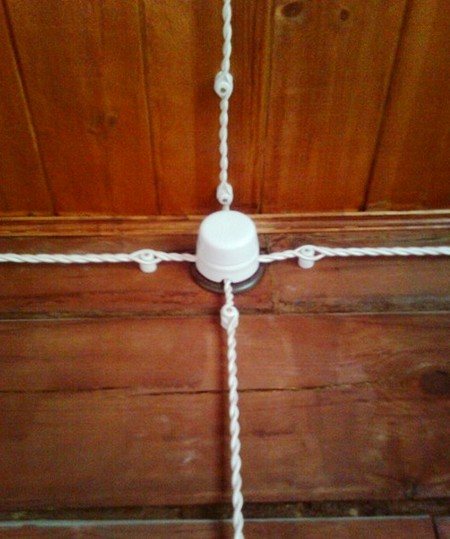 Таким способом прокладывали самые первые проводки. В старых деревенских домах до сих пор устанавливают электропроводку открытого типа. Мода на них возвращается снова. Два провода переплетаются друг с другом и протягиваются по периметру помещения, периодически огибая керамические изоляторы. По технике безопасности ролики-изоляторы монтируются на расстоянии 10 см друг от друга, а витой провод не менее 1.5 см. от поверхности.