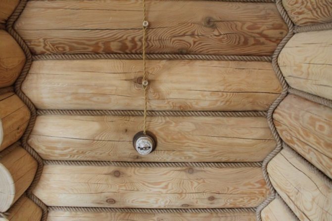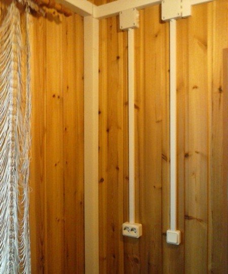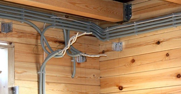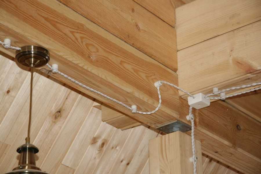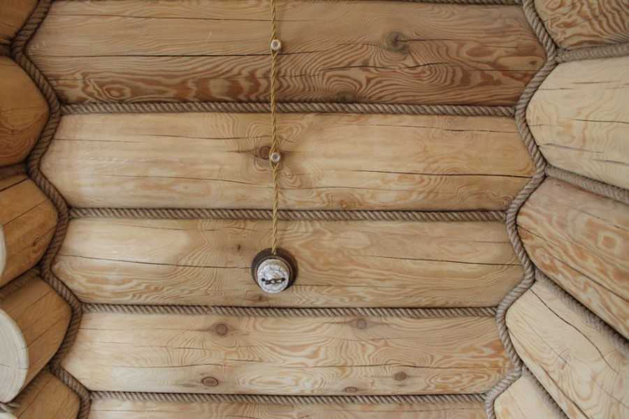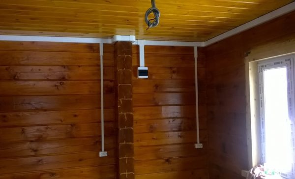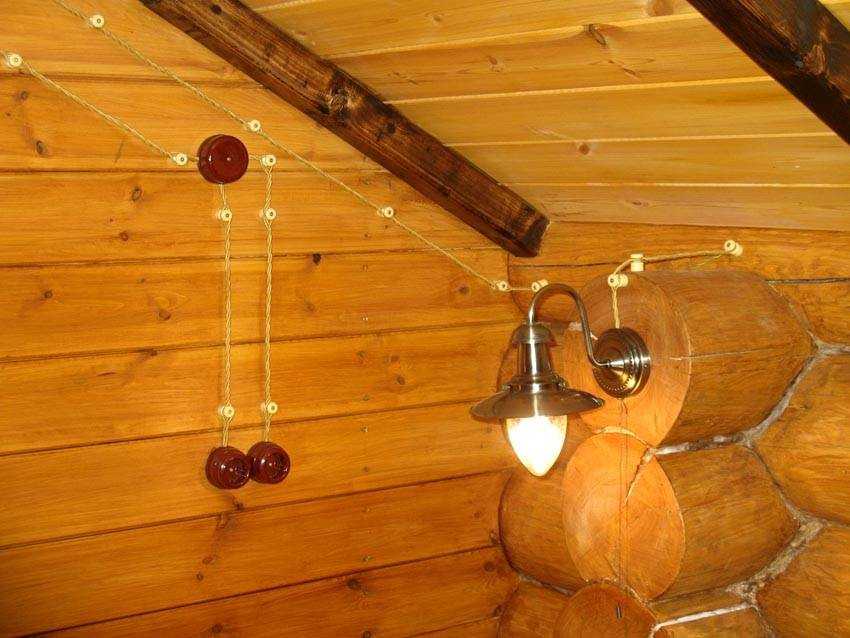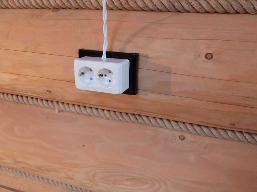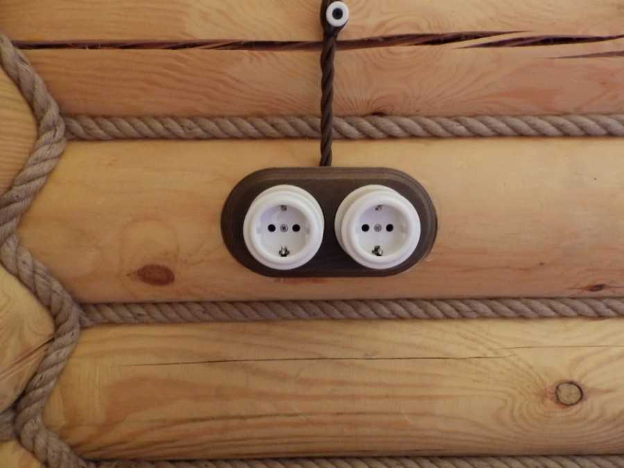 Первая причина ясна — эстетические соображения. Вторая — технические сложности при выполнении скрытой проводки в домах из бревна. По требованиям ПУЭ в сгораемых конструкциях (деревянных стенах) прокладка проводки может проводится только в глухих (без перфорации) металлических коробах. Второй вариант — в негорючей штукатурке. Причем окружать проводник должен слой в 1 см. Мягко говоря, это трудновыполнимо.