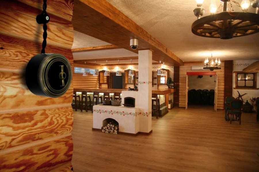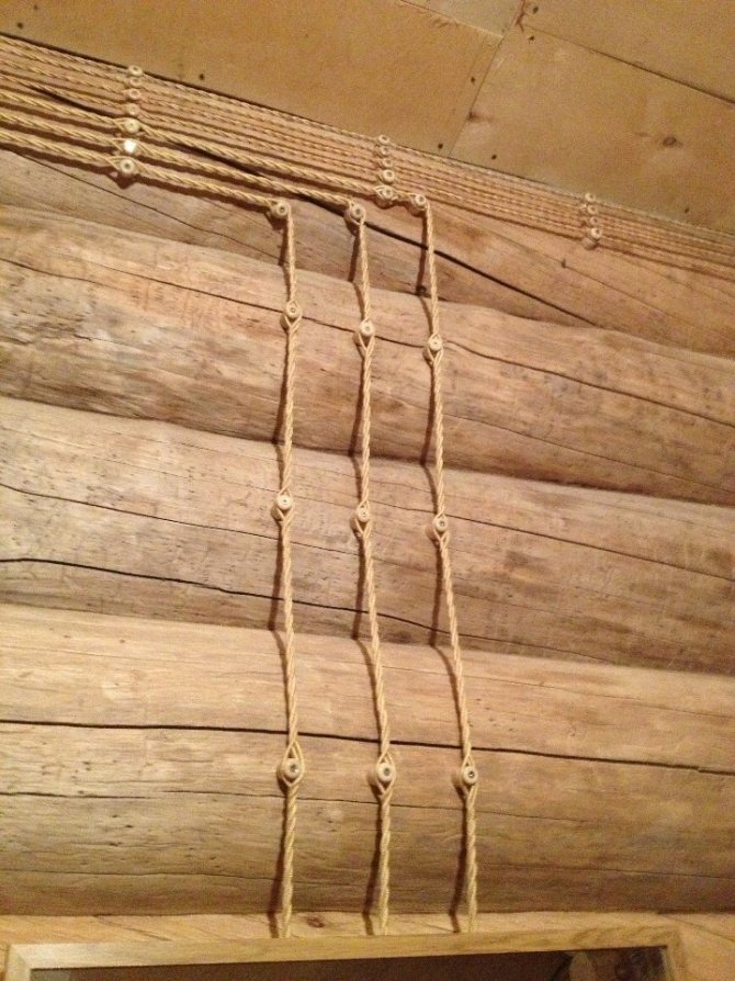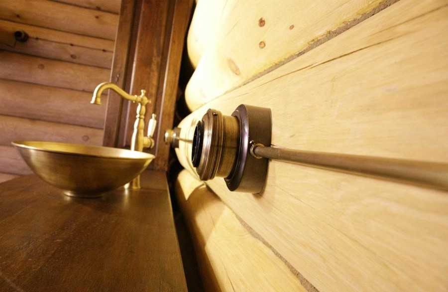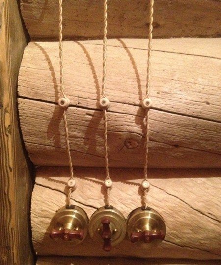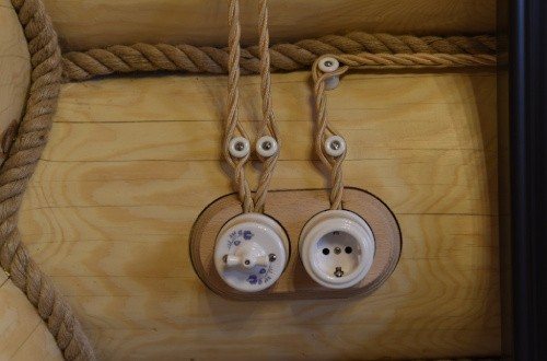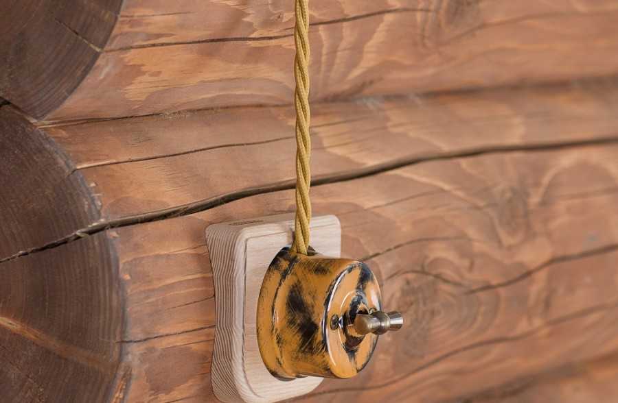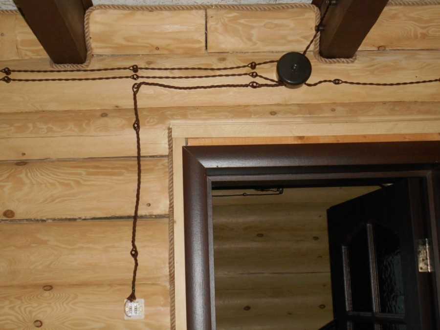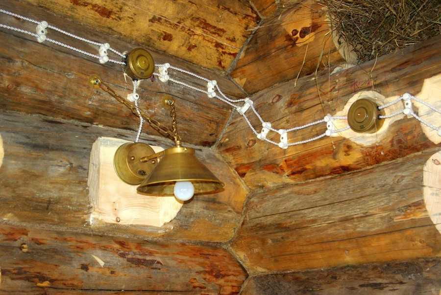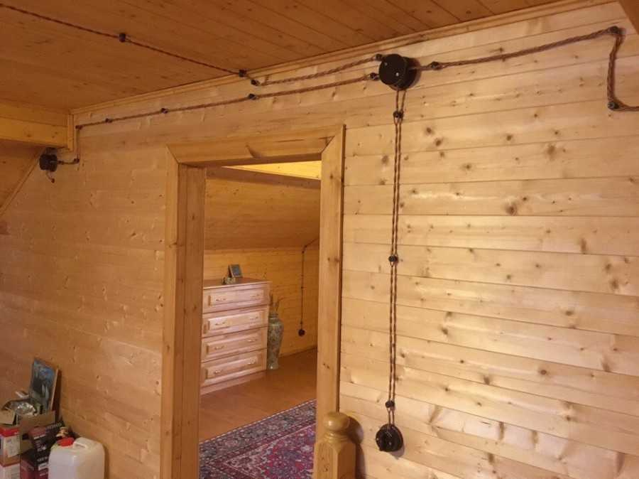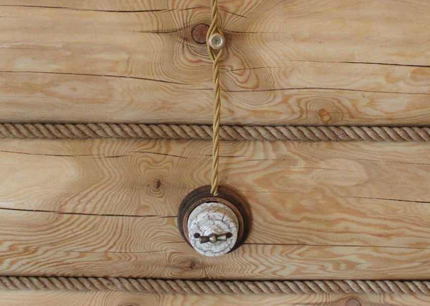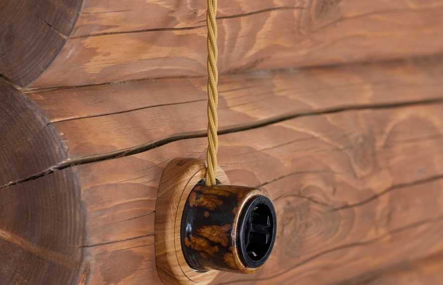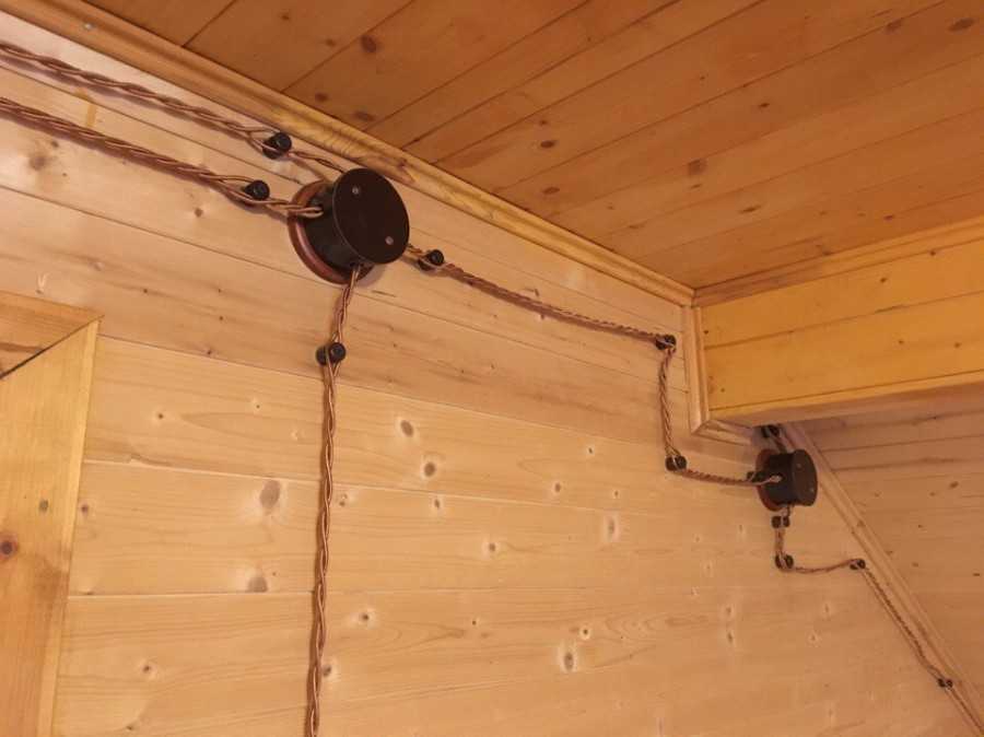 Проблема в прокладке кабеля проводки в металлических коробах состоит не только в том, что придется делать глубокие штробы. Основная сложность в том, что деревянный дом все время меняет свою высоту. Даже после того как прошла основная усадка, изменения есть и носят они сезонный характер — во влажные периоды стена становится выше, в сухие оседает. Разница в высоте может составлять до 5-7 см на один этаж. Так как металлические короба не тянутся, это становится серьезной проблемой. В общем, получается, что открытую проводку сделать проще. Ну а раз уж провода будут тянуться поверх, то из них можно сделать украшение, что и получается, если грамотно сделать ретро-проводку.