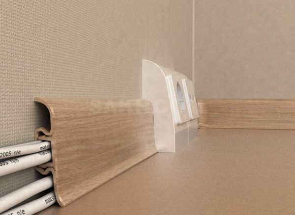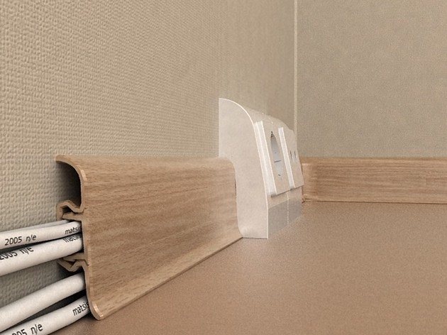 Подходящий способ для сохранения внешнего вида комнаты. От обычного плинтуса данный вид разводки отличается наличием нескольких каналов и способом монтажа.