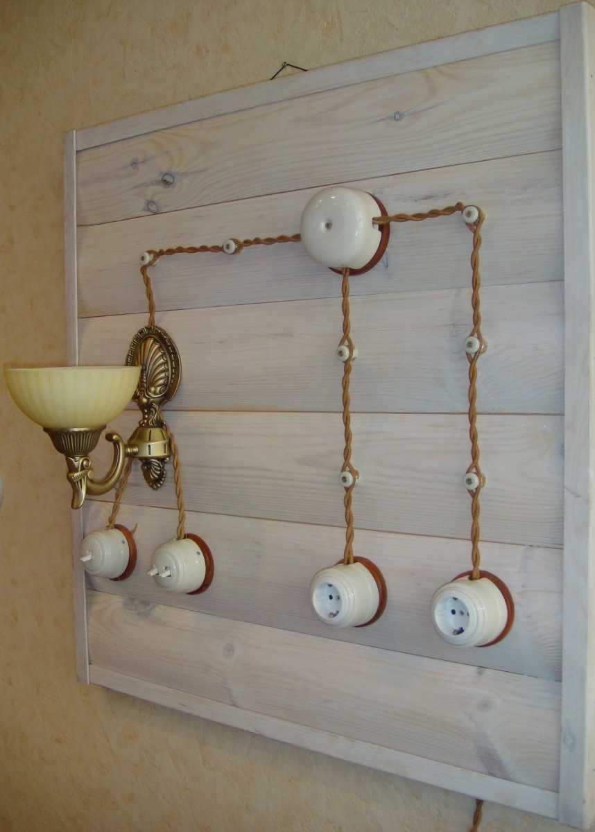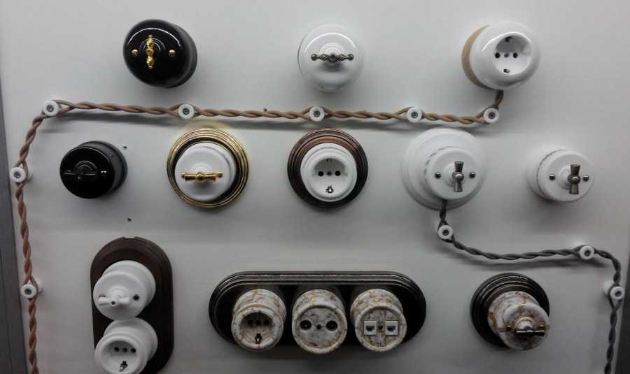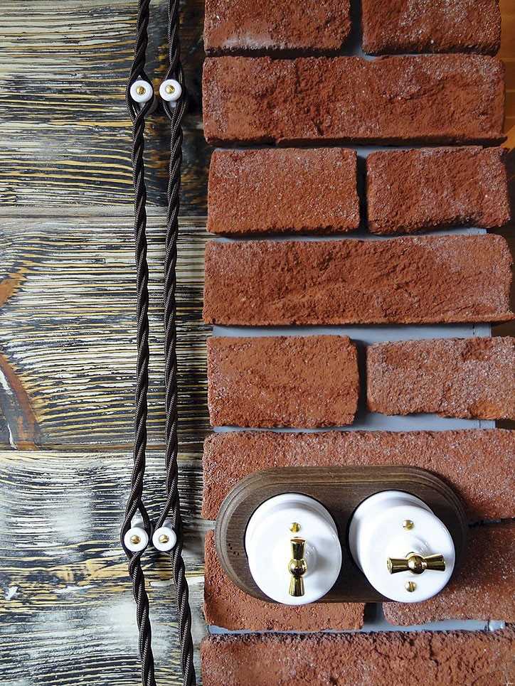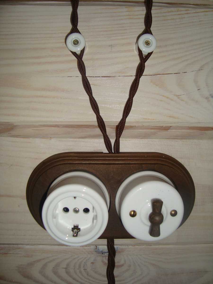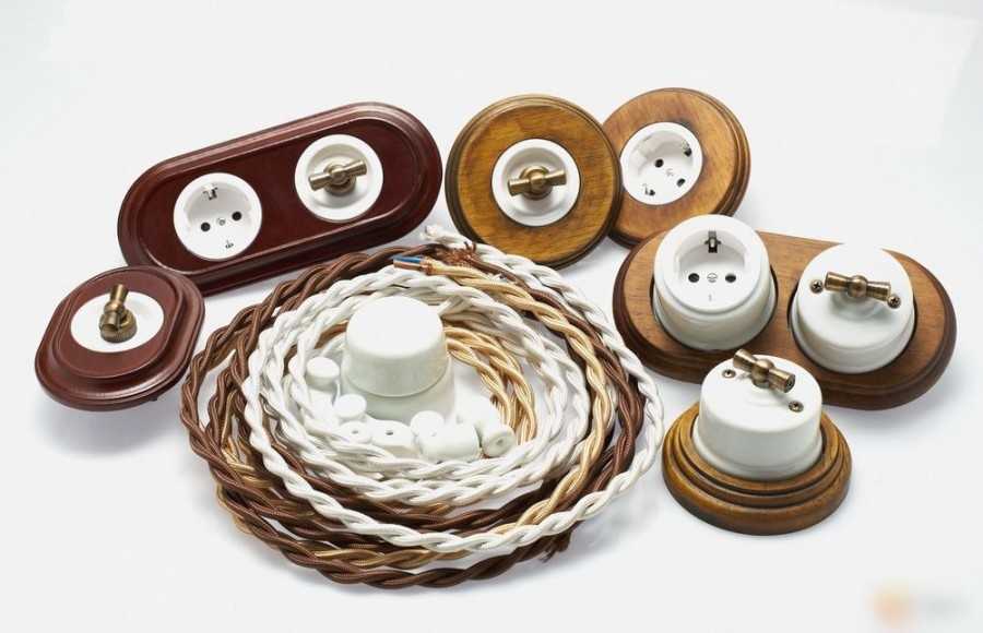 Розетки, выключатели, распаечные (монтажные) коробки можно использовать обычные — пластиковые. Но чтобы выглядело все органично, имеет смысл поставить фарфоровые или металлические и тоже в стели «ретро». Они также отвечают требованиям безопасности, так как сделаны из несгораемого материала.