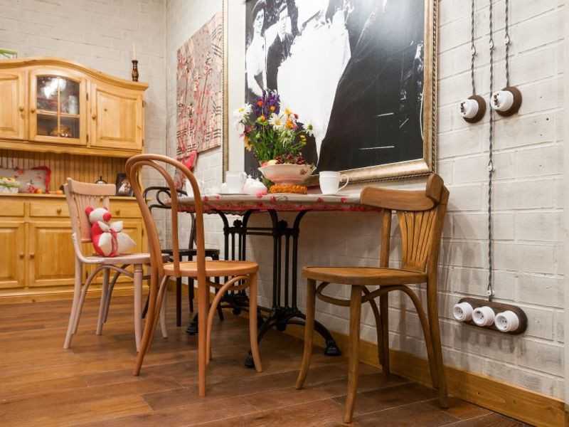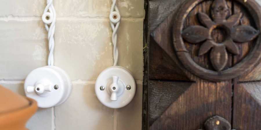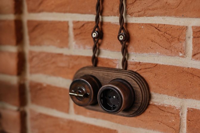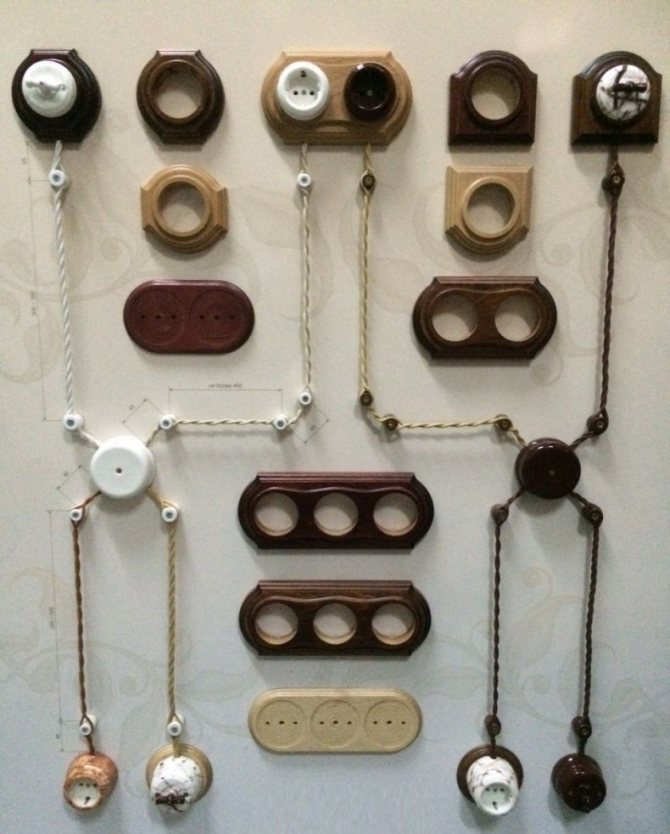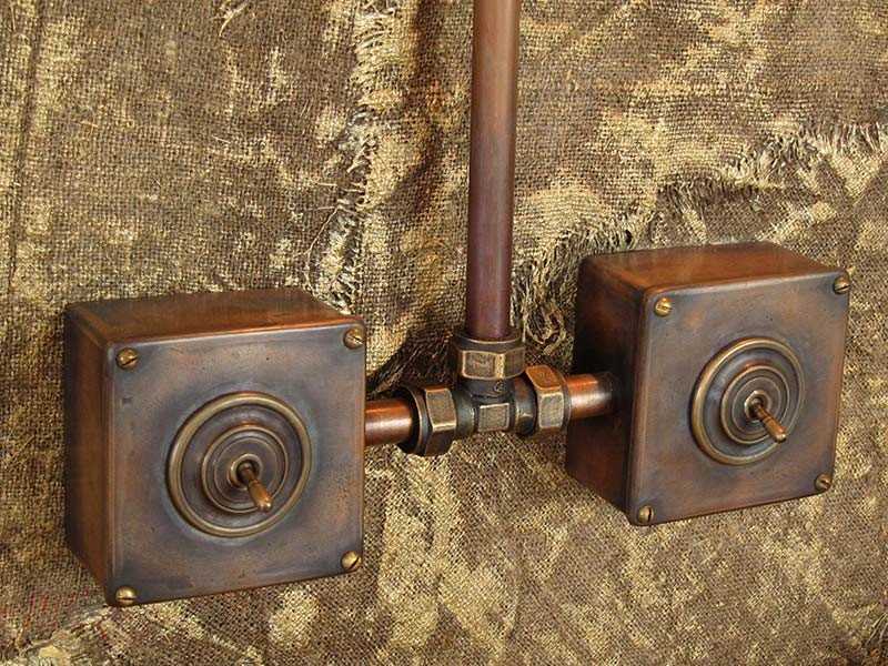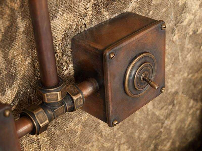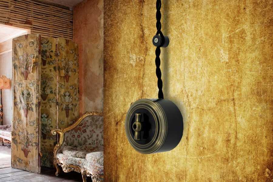 Розетки, выключатели, распаечные (монтажные) коробки можно использовать обычные — пластиковые. Но чтобы выглядело все органично, имеет смысл поставить фарфоровые или металлические и тоже в стели «ретро». Они также отвечают требованиям безопасности, так как сделаны из несгораемого материала.