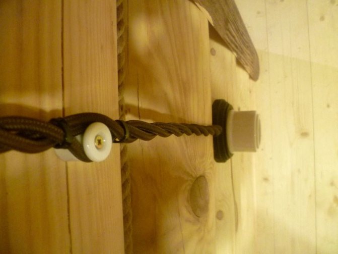 - Если стены поддерживают горение — крепление электрической проводки к стене производится с помощью изоляционных катушек, а сам провод не должен касаться поверхности.