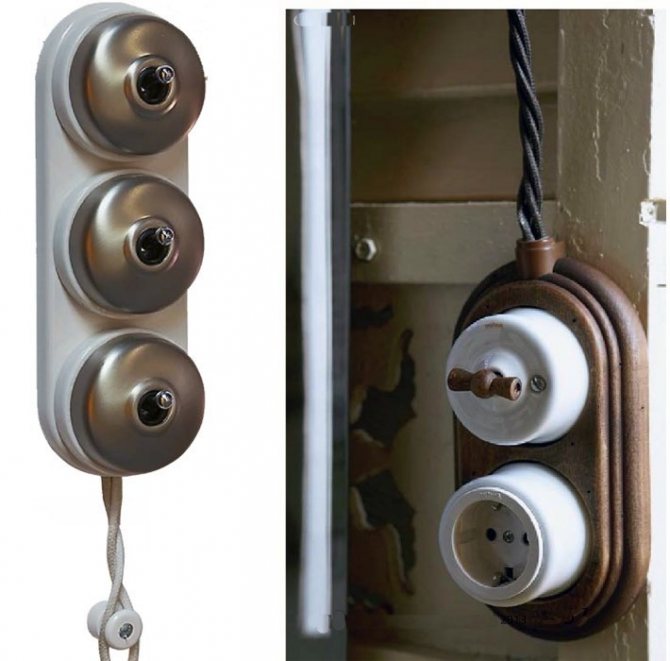 - Выключателей с непривычными сейчас механизмами поворотных ручек или тумблеров;