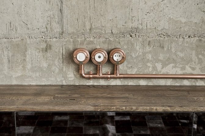 Вместо кабель-каналов провода могут быть спрятаны в электротехнических трубах, в основном выполняющих защитную, а иногда и декоративную функции. К примеру, их часто используют при оформлении помещений в скандинавском или лофт-стиле. Однако более эффективен такой способ при организации открытой проводки в ванной или другой комнате с повышенным уровнем влажности. Они обеспечивают полную герметичность, чего не скажешь о кабель-каналах. Также важно использовать розетки, распределительные коробки и выключатели, оснащенные дополнительной защитой от влаги.