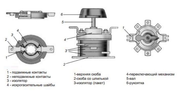 Сам корпус прибора сборный: его составляют из электроизоляционных шайб, которые скрепляют специальными шпильками. Клеммами подвижных контактов управляют посредством рукояти, которая задействует пружину переключающего механизма