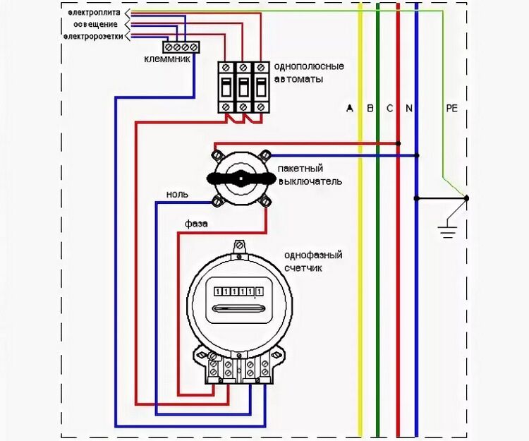 Две входные клеммы пакетника подключают к проводам фазы и нуля, которые идут от электросчетчика. А выходные клеммы подключают к автоматам в щитке.