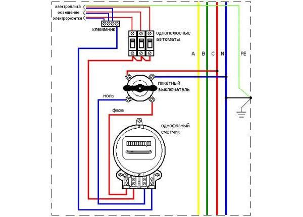 Для наглядного примера рассмотрим схему подключения пакетного выключателя к однофазному счетчику: