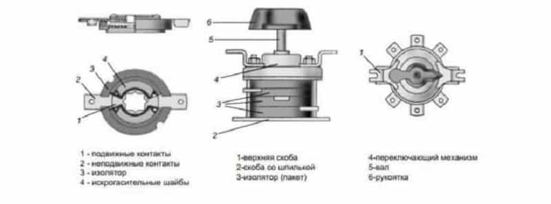 Электрическая дуга, образующаяся во время отключения или переключения электроцепи под нагрузкой, гасится благодаря действию пружин быстрого переключения. Главные преимущества прибора – безопасность, простота управления, компактность. К минусам можно отнести недолговечность.