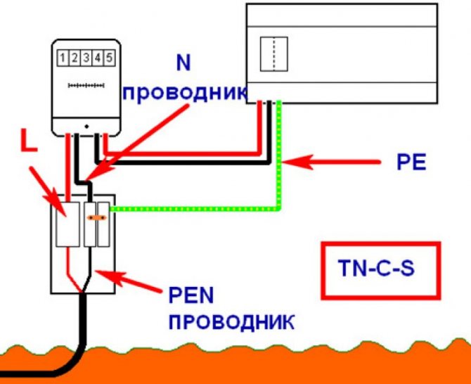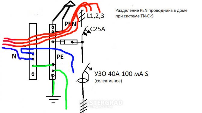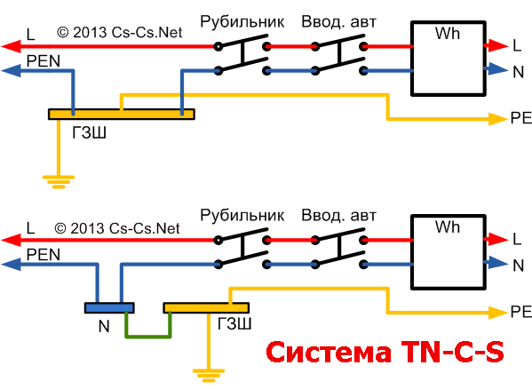 Обозначение TN-C-S значит, что на каком-то участке силовой цепи два проводника проложены совместно, а затем они разделены по функциональному признаку.