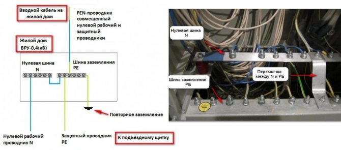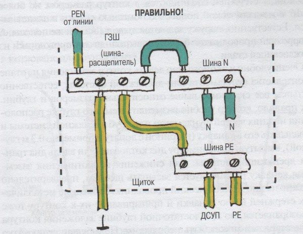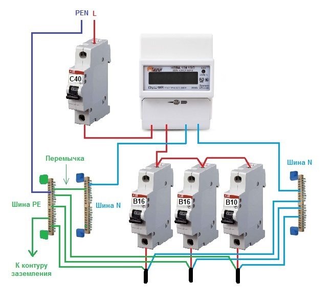 В частных домах и в городских квартирах в целях исключения воровства электроэнергии представители контролирующей организации вправе требовать, чтобы провод PEN был протянут до счетчика. И лишь после учетного прибора они разрешают разделять его на защитную шину PE и рабочую N. Такое подключение не противоречит требования ПУЭ, но гораздо естественней смотрится разделение, выполненное до счетчика.