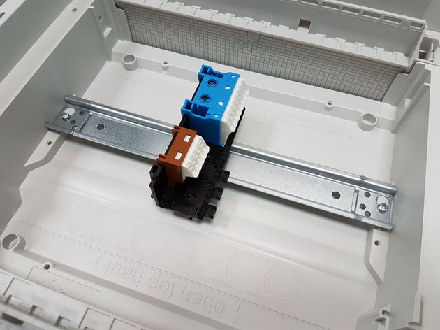 Самая простая процедура из всей темы «Как подключить автомат в щитке». На каждом автоматическом выключатели, с одной стороны (обычно с нижней) есть специальная пластиковая защёлка. Её необходимо отвести, установить автомат на DIN-рейку и вдавить до щелчка. После этого автоматический выключатель будет надёжно зафиксирован и можно переходить к его подключению.