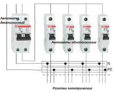Существуют схемы, при которых дифференциальный автомат подключается к группе пакетников, в других же схемах такие приборы используются исключительно для одного потребителя. При проектировании проводки лучше выбирать второй вариант, в котором при срабатывании прибора будет обесточен только один потребитель, а не целая группа автоматов.
