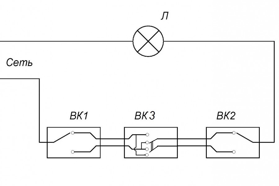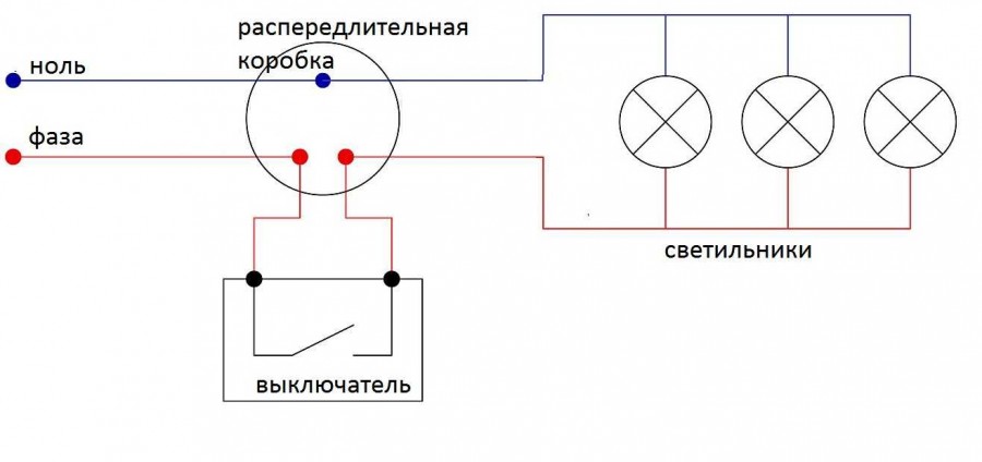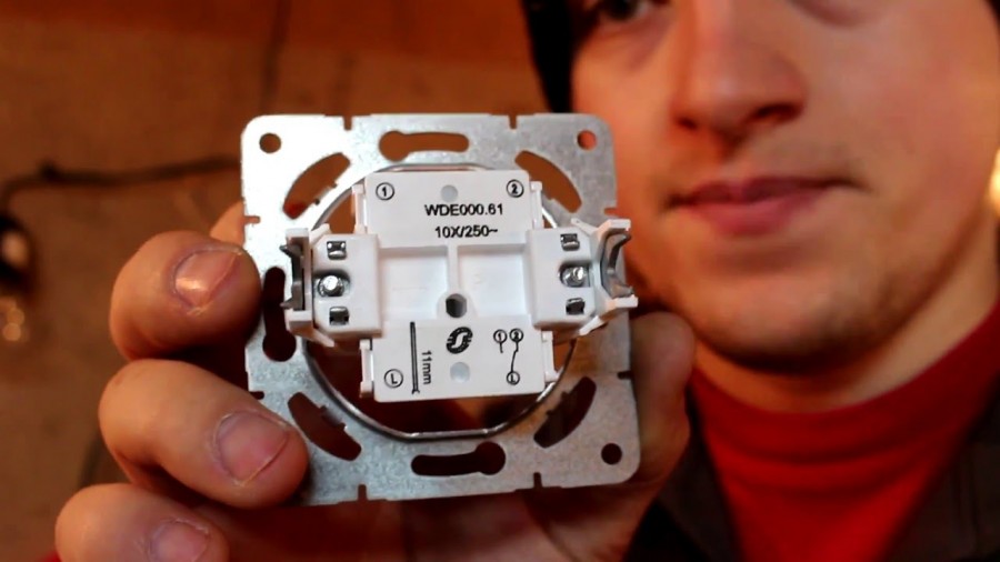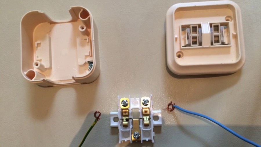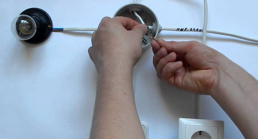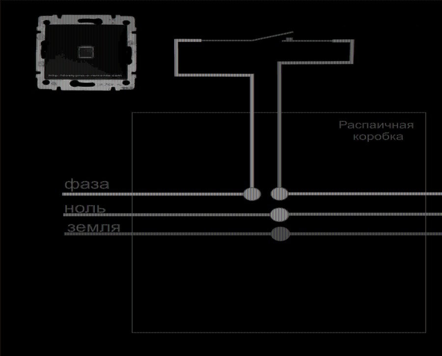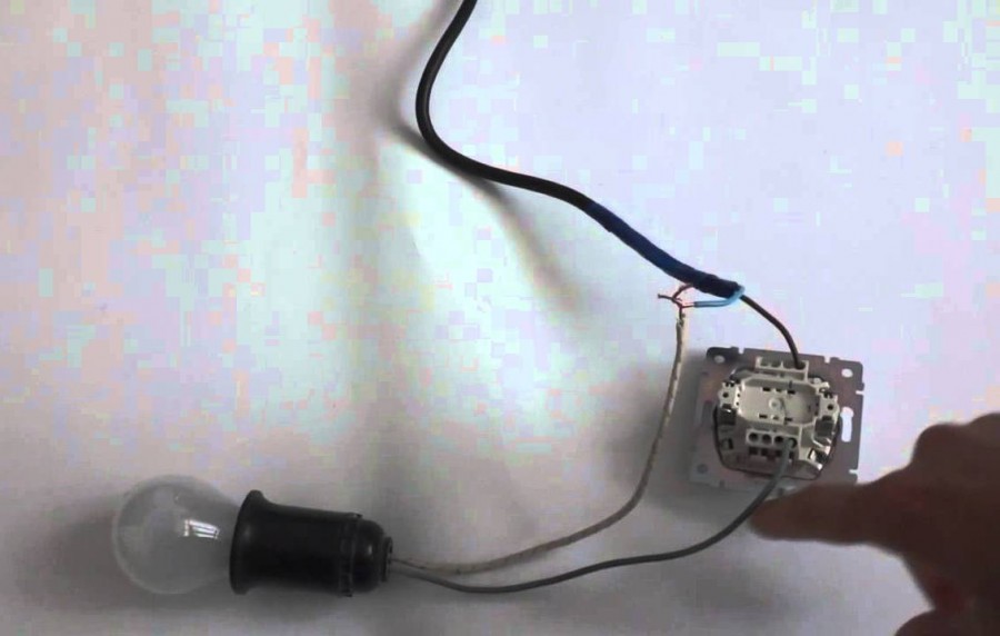 К фазе розетки подключается провод, вторая сторона которого прикрепляется на вводе выключателя. На вывод агрегата для выключения света, прикрепляется непосредственно подключенный к светильнику провод.