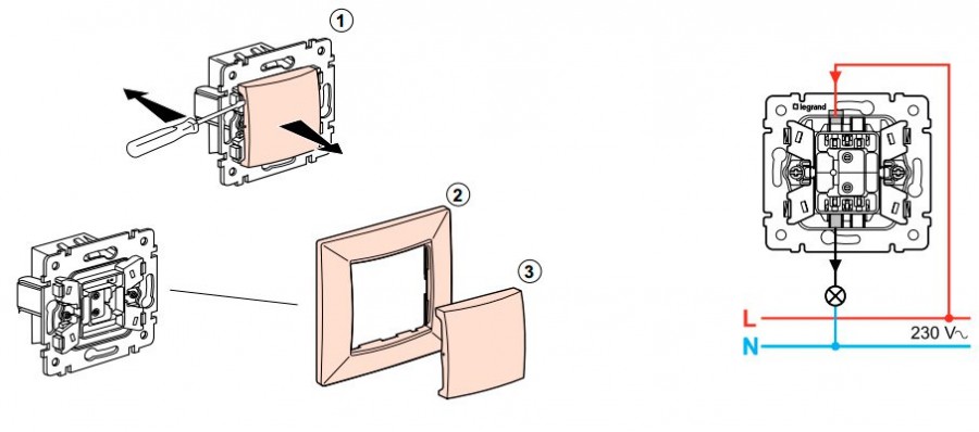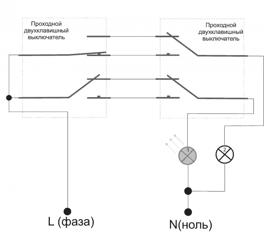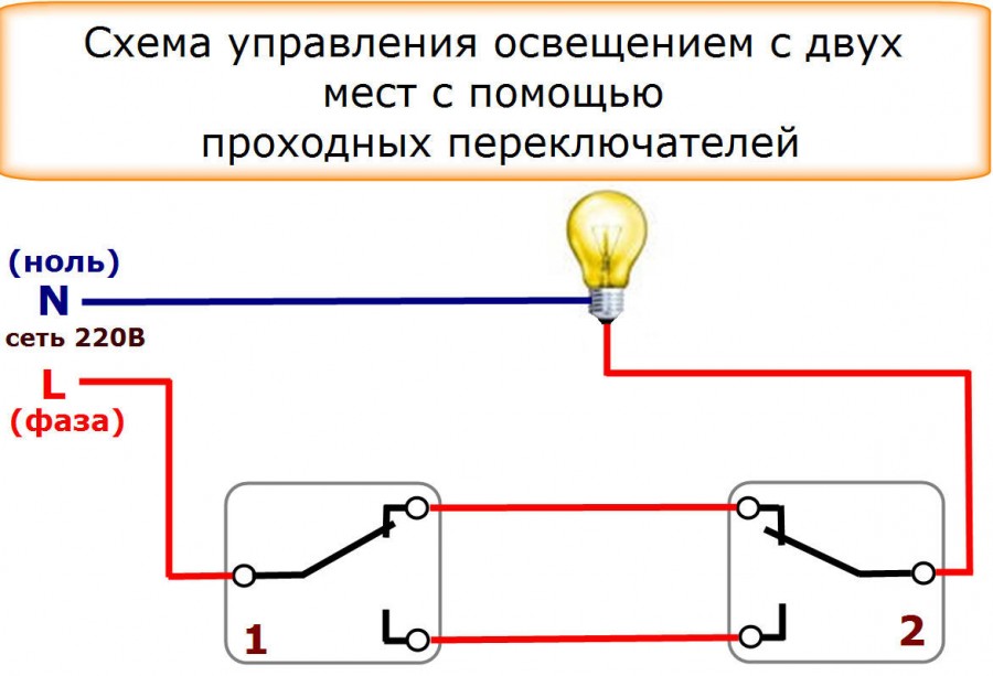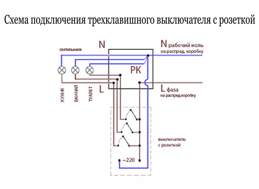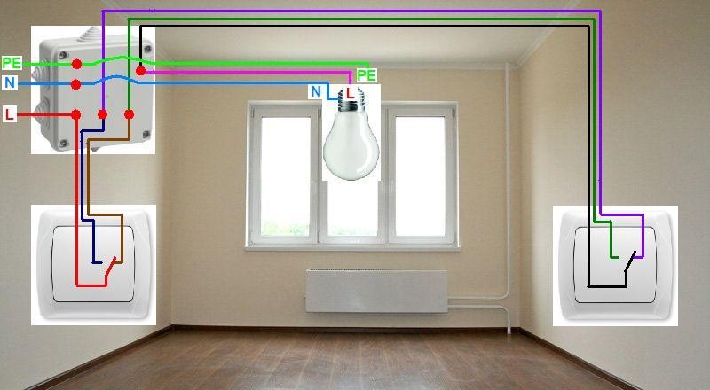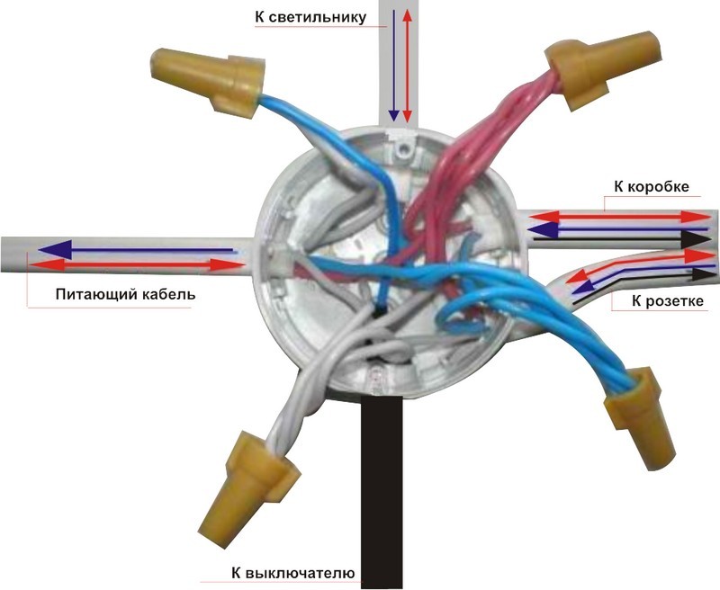 К фазе розетки подключается провод, вторая сторона которого прикрепляется на вводе выключателя. На вывод агрегата для выключения света, прикрепляется непосредственно подключенный к светильнику провод.
