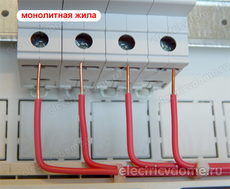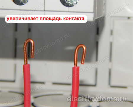 Контакт в месте соединения получается надежный, но его дополнительно можно улучшить без лишних затрат времени и средств. При подключении к автоматам кабелей с монолитной жилой сделайте на концах U-образный загиб.