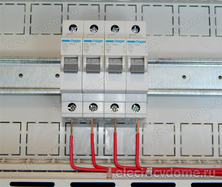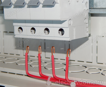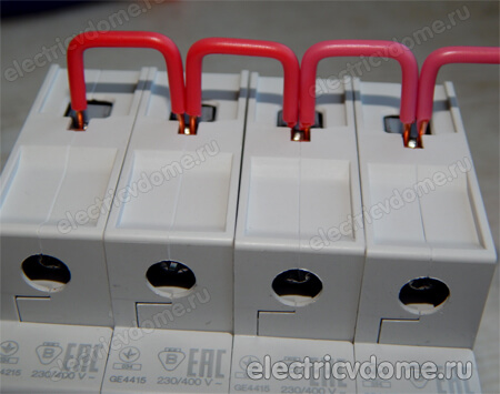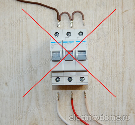 Такой способ монтажа одинаков как для однофазного, так и для трёхфазного автомата, потребуется только больше наконечников.