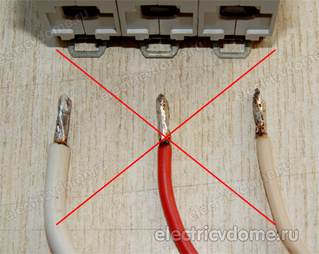 Ошибка — 2. Нельзя подключать несколько жил разных сечений на одну клемму АВ