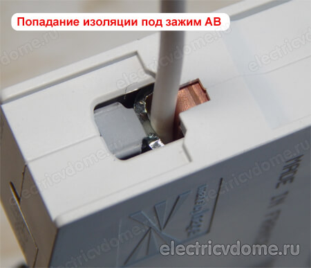 Этот пункт, скорее всего, относится не к ошибке, а к рекомендации. Для подключения жил отходящих проводов и кабелей к автоматам мы снимаем с них изоляцию примерно на 1 см, вставляем оголенную часть в контакт и затягиваем винтом. По статистике 80 % электриков именно так и подключают.