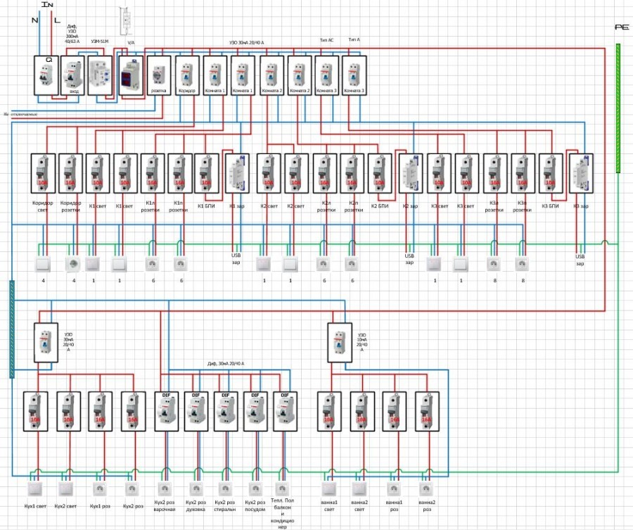 Любая схема с дифференциальным автоматическим выключателем — это отличная защита от КЗ и перегрузок для бытовых электроприборов и самой линии подачи электроэнергии, а также человека от поражения электротоком. Оптимально подобранная схема подключения способна выполнить все свои функции, конечно, если правильно выполнить монтаж дифавтомата.