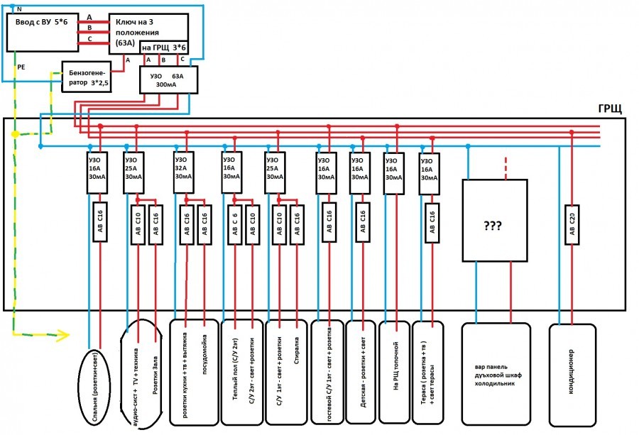 - Надежная схема подключения к однофазной линии с заземлением. Эта схема подключения дифавтомата является усовершенствованным вариантом. В ней реализуется принцип разделения потребителей электроэнергии на группы, где для каждой из них устанавливается отдельный дифференциальный выключатель. Надежность такого подключения безусловно выше, да и определить где возникла утечка тока или перегрузка в сети намного проще, чем при первом варианте. Недостатком такого подключения дифавтомата является повышение материальных затрат на приобретения дополнительных устройств.