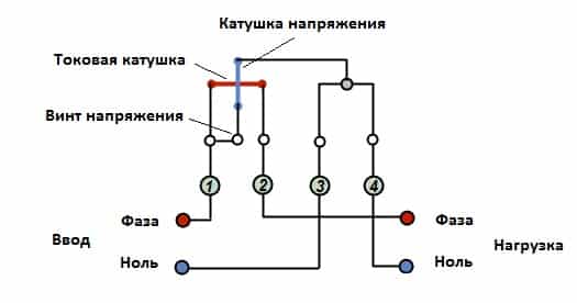 Провода питания после вводного автоматического выключателя зачищают от изоляции на 15 мм и подключают к 1 и 3 клемме, отводящие провода также зачищают от изоляции и подключают к 2 и 4 клемме, соответственно схеме на крышке прибора.