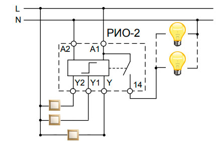 Провод оранжевого цвета отвечает за фазу коммутации и должен подсоединяться к выходу, обозначенному Y, а затем идти через 14 клемму на лампы. Для соединения нулевой фазы провод ведут на клемму N, а потом — на светильник. Для выключения света нужно нажать на любой выключатель, чтобы осуществить кратковременную коммутацию провода фазы, выходящего на клемму Y. После этого произойдет размыкание контактов 11-14. При последующем нажатии схема действия будет такой же, но разомкнутые контакты поменяют свое положение, что приведет к включению света.
