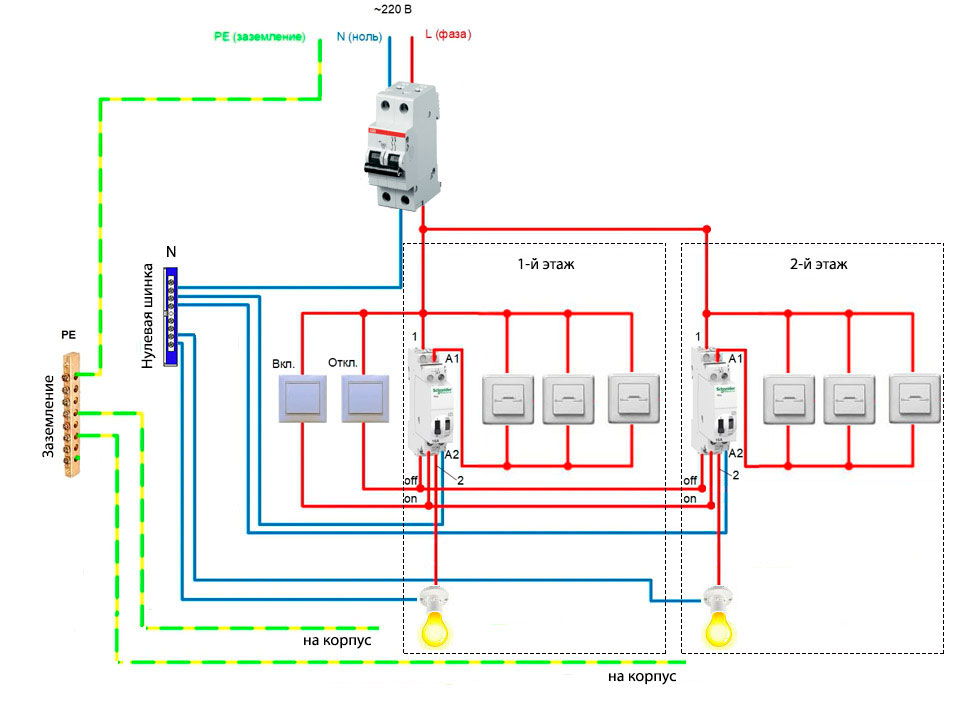 При использовании такого варианта соединения реле с выключателями потребуется меньше проводов, а их сечение может быть меньшим — от 0,5 мм2. В этом случае нужен еще один защитный аппарат. Такой вариант подключения используют реже первого. Выявление неисправностей в цепи здесь упрощается за счет использования двух автоматов, рассчитанных на 6 и 10 ампер.