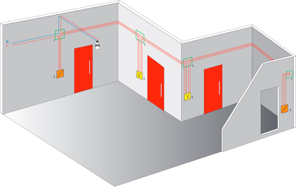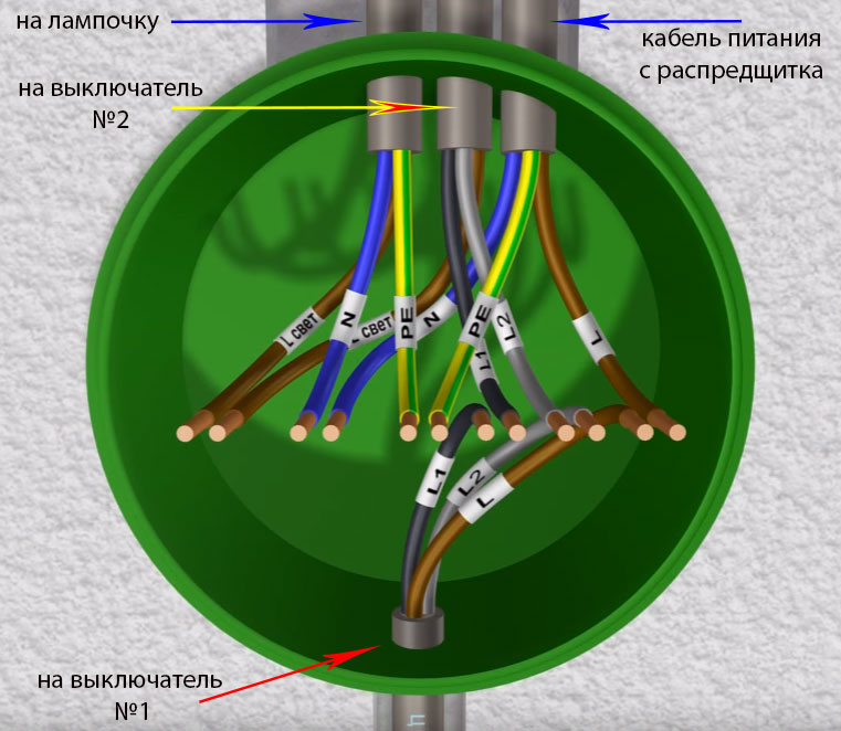 Как выглядит схема подключения на проходных? Как правило, питание первых делом подводится к ответвительной коробке под потолком, а далее от нее к самим выключателям. Для монтажа применяется трехжильный кабель ВВГнг-Ls 3*1.5мм2.