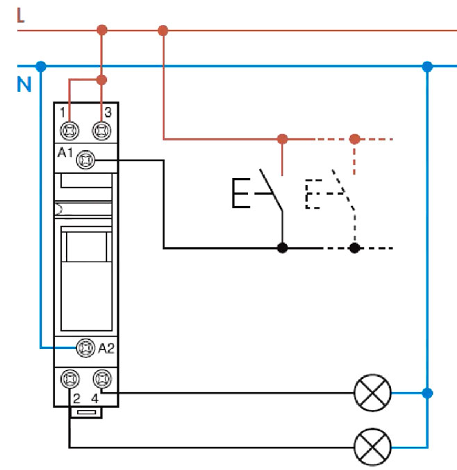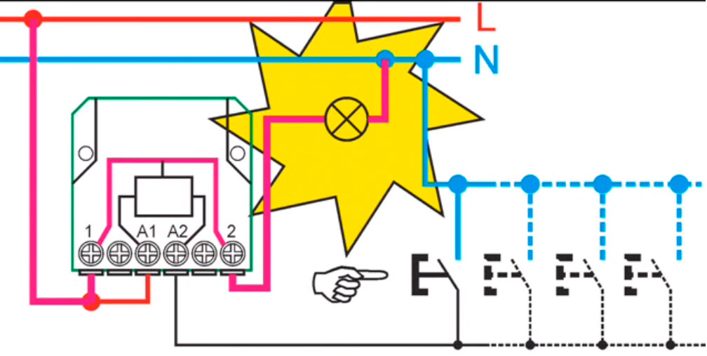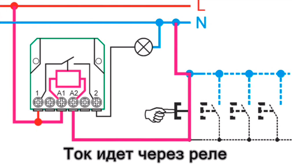 Обратите внимание, что в импульсном реле нагрузка вовсе не проходит через кнопку. Нажимая ее, вы всего лишь даете импульс на катушку, которая и замыкает силовой контакт.