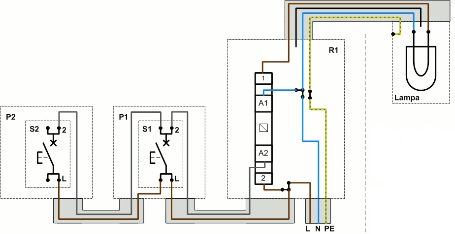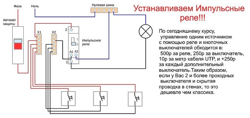 Сравните наглядно схему и количество проводов одного и того же помещения, при монтаже проходных выключателей и импульсных реле.